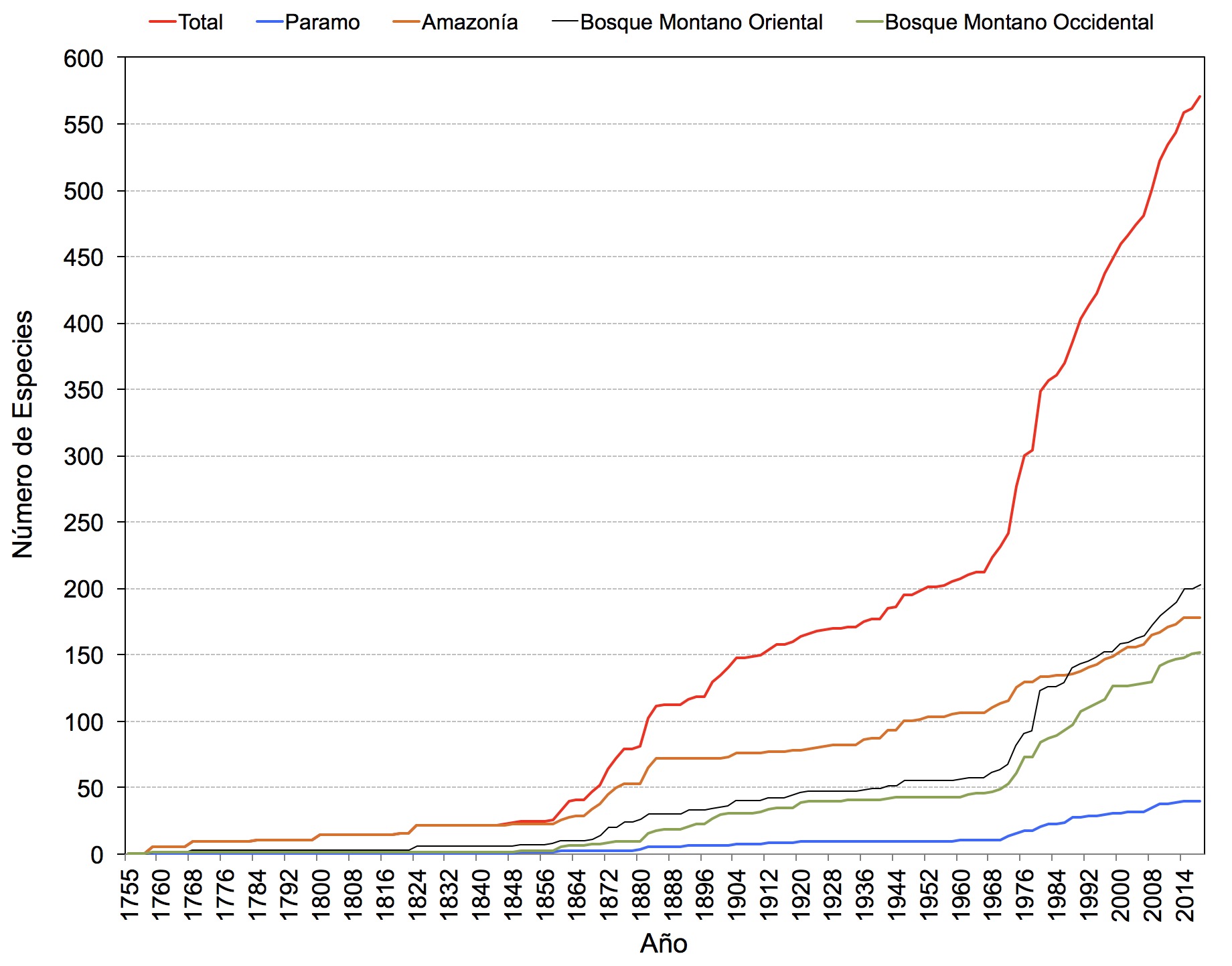 La fauna de anfibios del Ecuador es la cuarta más diversa en el mundo con un total de 633 especies formalmente descritas (hasta marzo de 2019). Este número, sorprendentemente alto para un país con tan solo el 5% de la superficie de Brasil, aumenta rápidamente debido a que hay un gran número de especies descubiertas cada año (por ejemplo, 9 especies descritas en 2016). Esta tendencia también es evidente a partir de la curva de acumulación de especies (Figura 1). Adicionalmente, se proyecta una aceleración en el descubrimiento de nuevas especies como producto del uso cada vez más generalizado de marcadores genéticos en la sistemática de los anfibios. Estudios recientes sugieren que hay un número considerable de especies crípticas que han sido pasadas por alto en revisiones previas basadas en caracteres morfológicos (1, 2). Se han encontrado numerosas especies crípticas en estudios de Engystomops (1), Dendrobatidae (3), y Centrolenidae (4) entre otros.